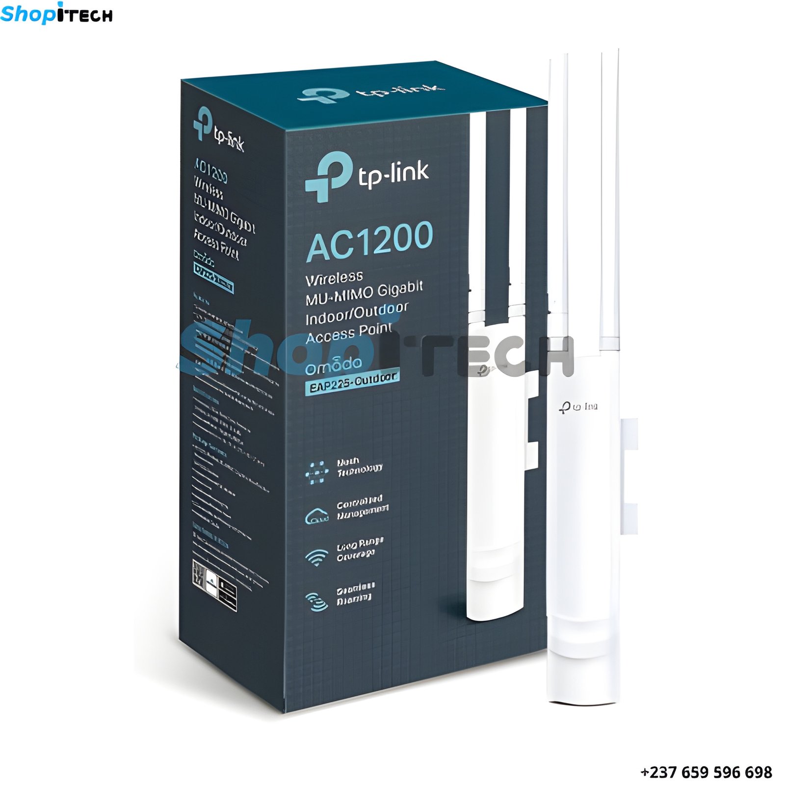 Point d’accès WiFi extérieur TP-Link EAP225-Outdoor double bande AC1200 conçu pour fournir une connexion sans fil stable et longue portée dans les espaces extérieurs, avec installation PoE simple et gestion centralisée Omada.